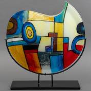 Kleurrijk cirkelvormig glasobject in metalen houder, hoogte 50cm