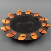 Bernice Schutte (1966), 'Doodekaflex', schaal opgebouwd uit oranjegeglazuurde keramische staanders, rubber cirkel en bandjes, herkomst: Collectie Galerie Jas, Utrecht -rubber gescheurd langs binnenzijde, één bandje met scheurtje-, 8 × Ø 50 cm