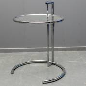 Ronde bijzettafel met verchroomd metalen onderstel en in hoogte verstelbaar glazen blad, reproductie naar ontwerp van Eileen Gray, uitvoering onbekend, -krasjes-, 70 × Ø 50 cm
