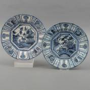 Paar Delfts aardewerk schotels met blauw-wit decor in Wanli-stijl: vogel aan de waterkant, niet gemerkt, tweede helft 17e eeuw -randdefecten-, Ø 30 cm