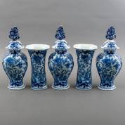 Vijfdelig Delfts aardewerk kaststel met blauw-wit chinoiseriedecor: vogel bij bloem, gemerkt LPK, uitvoering De Porceleyne Lampetkan, derde kwart 18e eeuw -enkele defecten en restauraties-, hoogte 33,5 cm