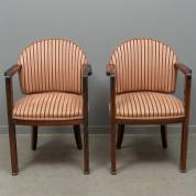 Paar coromandel armstoelen met roze-beige gestreepte bekleding, uitvoering 't Woonhuys, Amsterdamse School, circa 1910-1920 -poten licht gedeukt, lichte slijtage aan bekleding-, -opbrengst ten bate van het Rijksmuseum Amsterdam-