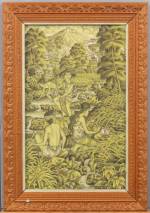 Balinese School: werkers op het land met in het verschiet een vulkaan, acrylverf op doek, r.o. gesigneerd: 'W. Rupa Peliatan Bali', in rijkgesneden lijst, 54 × 33 cm