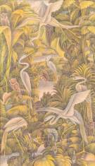 Balinese School: reigers, uilen en vlinders bij de drinkplaats, acrylverf op doek, m.o. gesigneerd K. Buka, Bali, midden 20e eeuw, in rijk gesneden lijst, 63 × 36,5 cm