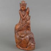Gesneden houten beeld: vrouw en kind bij mythisch wezen met vlammende tong, mogelijk Rangda en Barong, Bali, midden 20e eeuw, hoogte 38 cm