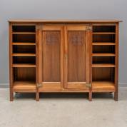 Mahonie boekenkast met twee open vakken en centraal twee deuren met snijwerk, ontwerp H.P. Berlage, vermoedelijk uitvoering 't Binnenhuis, circa 1901 -aan bovenzijde ingekort, de dekplank mogelijk niet origineel en aan rechter achterzijde is er een hoek uitgesneden, roedes niet aanwezig, kleine chipjes van houtsnijwerk-, 122 × 168 × 38,5 cm
