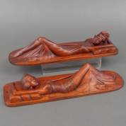 Paar gesneden houten beelden: liggend Balinees paar, niet gesigneerd, Bali, midden 20e eeuw -beide met ophanggaatje-, 9 × 47 × 15 cm