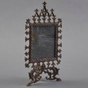 IJzeren fotolijstje omringd door neogotisch traceerwerk, achter het glas voorzien van waxinelichthouder, 28 × 14 × 9 cm, glas circa 12 × 10 cm