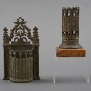 Twee pennenbakjes met hetzelfde neogotische reliëfdecor, midden 19e eeuw -natuurstenen basementje met chips-, hoogste 14 cm