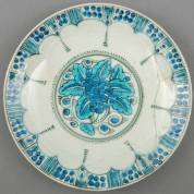 Delfts aardewerk bord met nieuw-Perzisch floraal decor, uitvoering De Porceleyne Fles, begin 20e eeuw -gebroken en gelijmd-, Ø 23 cm
