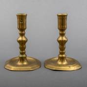 Paar koperen kandelaars op vierkante voet met afgeronde hoeken, Vlaanderen, 18e eeuw -sleets, restauraties-, hoogte 13 cm