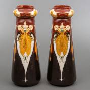 Paar plateel vazen met geel-bruin decor op zwart font, decor 3049, uitvoering Plateelbakkerij Haga, Purmerend, schildersmonogram WL, 1903-1907 -één met miniem chipje onderop-, hoogte 31 cm