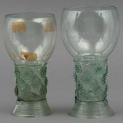 Twee groot formaat roemers met braamnoppen op de stam en draadglazen voet, 17e eeuw -één met barst onderin, de ander gebroken en geplakt met plakband-, de grootste 19,4 × Ø 10,5 cm