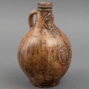 Steengoed baardmankruik met stadswapen op de buik, Frechen, eind 17e eeuw -randchips-, 26 × Ø 18 cm