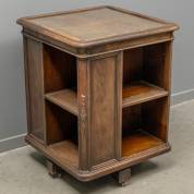 Mahonie boekenmolen met afneembaar glazen blad, 20e eeuw -glazen blad gebroken, enkele fineerschades onder bladrand-, 77 × 58 × 58 cm
