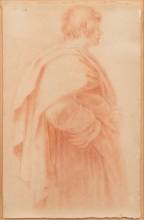 Roodkrijttekening: kostuumstudie, niet gesigneerd, verso met label: 'Kostuumstudie 17e of 18e eeuw geïnspireerd op Andrea del Sarto 1478-1530, Firenze, volgens oordeel van het Rijksbureau voor Kunsthistorische Dokumentatie te Den Haag op 11 nov. '64', 23,5 × 15 cm
