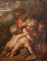 Jacob de Wit (1695-1754), allegorie op de herfst met putti en druiventrossen, r.o. gesigneerd en gedateerd 1732 -gedoubleerd, restauraties-, 72 × 57 cm