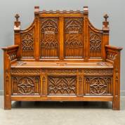 Eiken halbankje met rijk gestoken rug en klep in de zitting, neogotiek, 120 × 134 × 47 cm