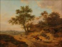 Omgeving Johann Bernard Klombeck (1815-1893), boer en boerin wandelend met vee in landschap, olieverf op paneel, niet gesigneerd, 25,5 × 31,5 cm