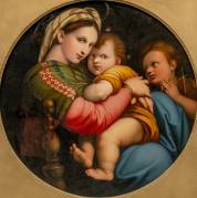 Schilderij: 'Madonna met de stoel', kopie naar origineel van Raphaël Santi (1483-1520) in Palazzo Pitti, Florence, olieverf op paneel, niet gesigneerd, circa 1870 -craquelé, enkele plekken opbollende verf en inschilderingen-, Ø 73 cm