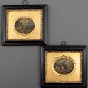 Twee miniatuurschilderingen: ruitergevecht en jachtpartij -gebobbeld, klein stukje verfverlies-, beide olieverf op koper, 4,5 × 5,5 cm