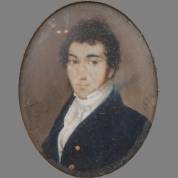 Miniatuurportret: man met krullend haar, lange bakkebaarden, wit vest met hoge kraag en witte halsdoek, l.o. gesigneerd J. Flack en r.m. gedateerd 1824 -lichte schade en verkleuring-, 5,5 × 4,2 cm