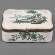 Aardewerk dekseldoosje met groen-wit landschapsdecor, onderop gemerkt VP, Frankrijk, 19e/20e eeuw, 4 × 10 × 7 cm