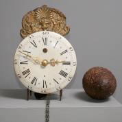 Normandische lantaarnklok met geëmailleerde wijzerplaat en kleine latoenkoperen feuille met gedreven decor: hoorn des overvloeds geflankeerd door mythische wezens, 18e eeuw, hoogte 39 cm