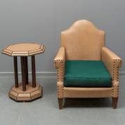 Met leder beklede fauteuil afgezet met nagels, het kussen voorzien van stoffen bekleding -kussen sleets-, 86 × 69 × 73 cm, en met leder bekleed octagonaal rooktafeltje, met kopspijkers gedecoreerd, staand op vier ronde beuken poten eindigend in octagonale voet gelijkend op het blad, art deco, jaren '20-'30, 60 × Ø 48 cm
