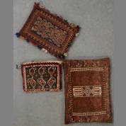 Drie kleine Perzische kussentjes: Afshar soumakkussentje, Afshar met botehmotieven, en Belouche, grootste 43 × 32 cm