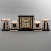 Marmeren schouwklok met twee tazza's, jaren '20-'30 -gebruikssporen-, 23 × 45 × 11 cm