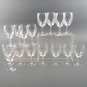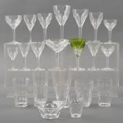 Uitgebreid 170-delig kristallen glasserviesgedeelte met gefacetteerde kelk en stam, model Nestor, uitvoering Cristalleries du Val-Saint-Lambert, België, bestaande uit: 22 champagnecoupes, tien rode wijnglazen, zeven witte wijnglazen -eentje een fractie lager-, vijf wijnglazen met groene kelk, kleine wijnglazen in vijf groottes van minstens zes stuks per reeks, likeurglaasjes in vier groottes van minstens zes glaasjes per reeks, nog een reeks van vijf in een tussenformaatje, 36 water/limonade/bierglazen in diverse reeksen, en zeven vingerkommen -enkele stuks met een chipje-