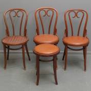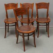 Vier bruingebeitste beuken caféstoeltjes, zitting en rugleuning van geperst multiplex, ontwerp Michael Thonet, uitvoering Cosmos, Polen, onder licentie van Thonet, 1910-1930, aan de onderzijde gelabeld en gestempeld -gebruikssporen-, 90 × 43 cm