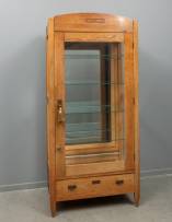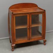 Eikenhouten ééndeurs vitrinekast met gesneden reliëf van twee zeeduivels in de kap, het interieur met vier glazen planken en daaronder één lade, tweede kwart 20e eeuw -vermaakt van linnenkast-, 199 × 92 × 45 cm