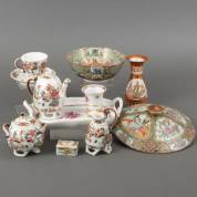 Divers Chinees en Europees porselein: Kanton kom en deksel, Satsuma vaasje, Herend dienblaadje en vaasje, theeservies met hanendecor -reparatie-, dienblaadje 27,5 × 17 cm