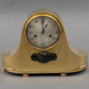 Koperen schoorsteenpendule met gefacetteerd ruitje, op vier pootjes, art deco, circa 1920, -opwindsleutel bijgevoegd, minieme gebruikssporen, werking niet getest-, 26 × 37 × 9 cm