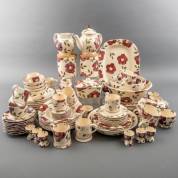 Porseleinen serviesgedeelte, decor Hellebore, ontwerp Mary Fedden, uitvoering Bridgewater, Engeland, bestaande uit: theepot, waterkan, suikerpot, melkkan, botervloot, twee voorraadbussen met houten deksel, vier ontbijtborden, vier dinerborden, negen diepe borden, negen pastaborden, negen grote kop-en-schotels, acht schotels Ø 11 cm, acht schotels Ø 16 cm, vijf kleine kopjes, acht theemokken, vier soepkommen, zes eierdoppen, vleesbord plat, vleesschaal hoog, vleesbord hoog, en drie diepe schalen -gebruikssporen, craquelé-
