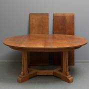 Ovale eiken coulissetafel met gesneden onderstel en twee tussenbladen, jaren '30, 74 × 161 × 121,5