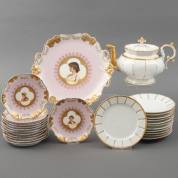 Divers porselein: theepot en twaalf taartbordjes met vergulde randen -vergulding sleets-, en twaalf taartbordjes en schaal met vergulde randen en vrouwenportretjes in roze fond -één bordje met chip-