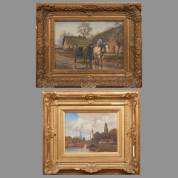 Hollandse School, twee schilderijen: boerenkar op landweg, en kanaal met stad in het verschiet, beide olieverf op doek, stadgezicht r.o. onduidelijk gesigneerd, beide 20e eeuw, boerenkar 24,5 × 34,5 cm