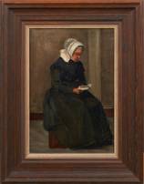 Hollandse School: vrouw met kanten muts leest de bijbel, olieverf op doek, niet gesigneerd, eind 19e/begin 20e eeuw -craquelé-, 33 × 22 cm