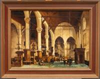 Koudbeschilderd twaalfpas tegeltableau met een kerkinterieur naar Johannes Bosboom, uitvoering onbekend -krassen-, 45 × 60 cm