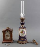 Kobaltblauwe porseleinen olielamp vermaakt tot elektrische tafellamp, met bloemdecor in goudomrande cartouche, 19e eeuw, en tafelklokje in noten kast met maanaanduiding, lamp: 65 × Ø 12 cm -opbrengst ten bate van het Rijksmuseum Amsterdam-