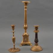 Drie messing kandelaars waaronder altaarkandelaar, 19e/20e eeuw -gebruikssporen-, hoogte 50 cm