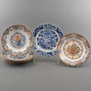Zes aardewerk wandschotels: serie van vier met polychroom bloemdecor, één met ander bloemdecor, alle vijf uitvoering Tichelaar, Makkum, Ø 35,5 cm, en één met blauw-wit bloemdecor, uitvoering De Porceleyne Fles, Delft, Ø 37 cm -enkele kleine glazuurschilfertjes van randen-