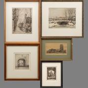Herman Heuff (1875-1945), 'Februarizon', droge naaldets, r.o. gesigneerd, 25 × 18 cm, 'Voorburg Laan van N.O. Indië, aquarel, l.o. gesigneerd, 21 × 15,5, 'Noordhavenpoort Zierikzee', droge naaldets 21/100, r.o. gesigneerd, 13 × 12 cm, Stadspoort, droge naaldets, r.o. gesigneerd, 9,5 × 6,5 cm, Dorpsgezicht met toren, droge naaldets, 19,5 × 10 cm