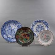 Aardewerk schotel met blauw-wit decor van kasteel omringd door bladeren en vruchten, ontwerp Guillaume Serpenti, uitvoering J. Camp, N.V. de Sphinx, Maastricht, Delfts aardewerk schotel met bloemdecor, uitvoering De Porceleyne Fles, plateel schotel, decor 1165/30, uitvoering Plateelfabriek Zuid-Holland, Gouda, en aardewerk bord met decor van ruiter in reliëf, uitvoering Royal Goedewaagen, Gouda, grote schotel Ø 42 cm