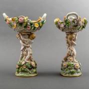 Paar porseleinen opengewerkte tazza's met polychroom beschilderde bloemenmand, beide gedragen door twee putti, naar Meissen -grote chip, kleine defecten, been van één putto bijgewerkt-, 29 × 21,5 × 16 cm