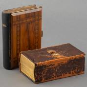 Kerkbijbeltje: Oude en Nieuwe Testament, 1898, gedrukt voor het Britse en Buitenlandse Bijbelgenootschap, met olijfhouten platten, het voorplat met Tunbridge Ware, slotje, en verguld koperen kantbeslag, daarbij: kerkbijbeltje: Nieuwe Testament en Psalmen, 1884, goud op snee, voorzien van gouden sluiting -voorplat los-