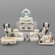 Kleine verzameling Staffordshire porselein, bestaande uit twee dekseldoosjes en vijf hondjes, 19e eeuw, hoogte 11 cm